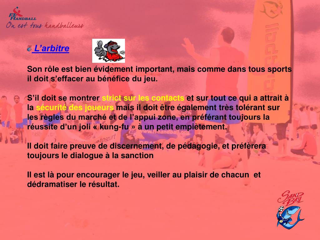 Les concepteurs de ce jeu ont su faire évoluer les règles. Certes les règles du Sandball tiennent sur une simple feuille mais chaque mot a son importance Nous reprendrons ici point par point les éléments incontournables que chaque arbitre doit connaître pour garantir le plaisir de tous.Attention jouer sur le sable permet beaucoup mais ne pardonne pas tout. Il est indispensable que chaque organisateur forme ses arbitres afin de veiller à la sécurité de chacun