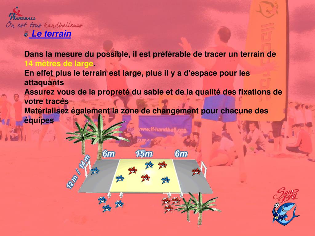 Le terrainDans la mesure du possible, il est préférable de tracer un terrain de 14 mètres de large.En effet plus le terrain est large, plus il y a d'espace pour les attaquants Assurez vous de la propreté du sable et de la qualité des fixations de votre tracésMatérialisez également la zone de changement pour chacune des équipes