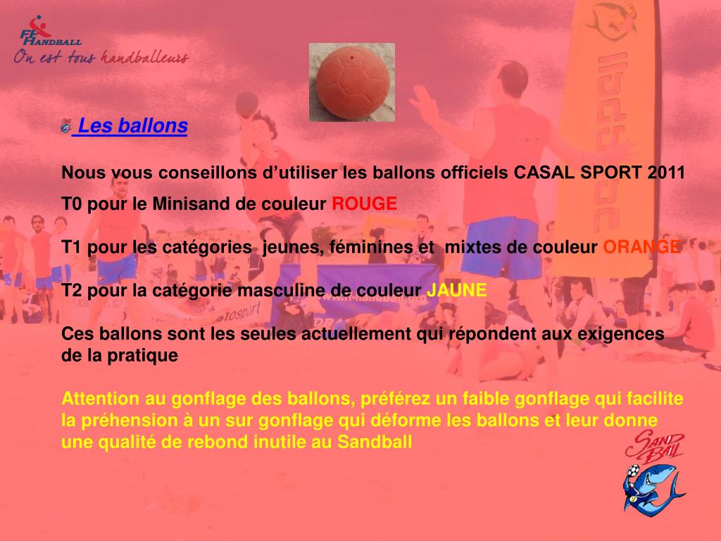 Les ballonsNous vous conseillons d’utiliser les ballons officiels CASAL SPORT 2011T0 pour le Minisand de couleur ROUGET1 pour les catégories jeunes, féminines et mixtes de couleur ORANGET2 pour la catégorie masculine de couleur JAUNECes ballons sont les seules actuellement qui répondent aux exigences de la pratiqueAttention au gonflage des ballons, préférez un faible gonflage qui facilite la préhension à un sur gonflage qui déforme les ballons et leur donne une qualité de rebond inutile au Sandball