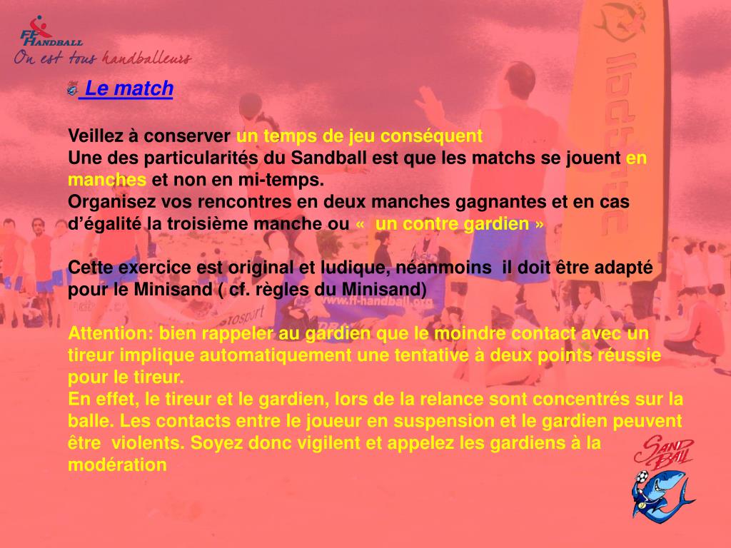 Le matchVeillez à conserver un temps de jeu conséquentUne des particularités du Sandball est que les matchs se jouent en manches et non en mi-temps.Organisez vos rencontres en deux manches gagnantes et en cas d’égalité la troisième manche ou « un contre gardien »Cette exercice est original et ludique, néanmoins il doit être adapté pour le Minisand ( cf. règles du Minisand)Attention: bien rappeler au gardien que le moindre contact avec un tireur implique automatiquement une tentative à deux points réussie pour le tireur. En effet, le tireur et le gardien, lors de la relance sont concentrés sur la balle. Les contacts entre le joueur en suspension et le gardien peuvent être violents. Soyez donc vigilent et appelez les gardiens à la modération