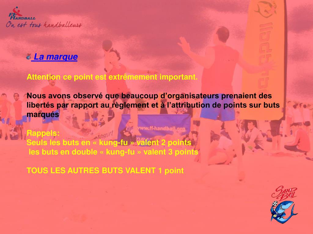 La marqueAttention ce point est extrêmement important.Nous avons observé que beaucoup d’organisateurs prenaient des libertés par rapport au règlement et à l’attribution de points sur buts marquésRappels:Seuls les buts en « kung-fu » valent 2 points les buts en double « kung-fu » valent 3 pointsTOUS LES AUTRES BUTS VALENT 1 point