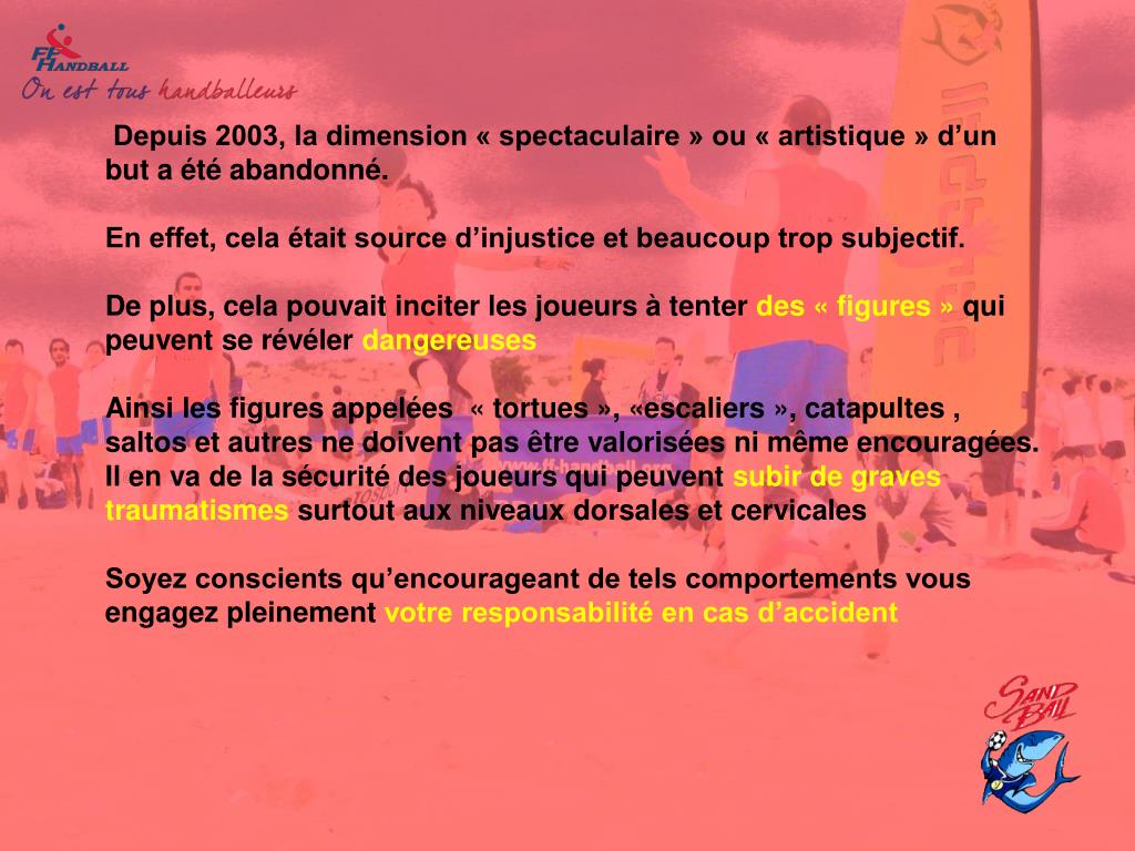 En conclusionNous vous demandons de bien respecter les principes de jeu Si vous choisissez malgré tout d’adapter le règlement -vous ne pouvez prétendre à appeler ce jeu Sandball. -vous engagez pleinement votre responsabilité en cas d’accident -votre demande de label vous sera donc refusée.Merci de votre investissement et de votre contribution au développement du SANDBALL Groupe SANDBALL FFHB