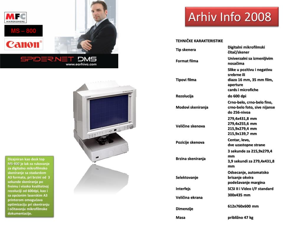 Arhiv Info 2008 MS – 800 Dizajnirankao desk top MS-800 je lakzarukovanjezadigitalnomikrofilmskoskeniranjesastadardom A3 formata, pribrziniod 3 sekundeskeniranjapofreimuivisokokvalitetnojrezolucijiod 600dpi,kaoisaopcionimlaserskim A3 printeromomogućavaoptimizacijupriskeniranjui očitavanjumikrofilmskedokumentacije.