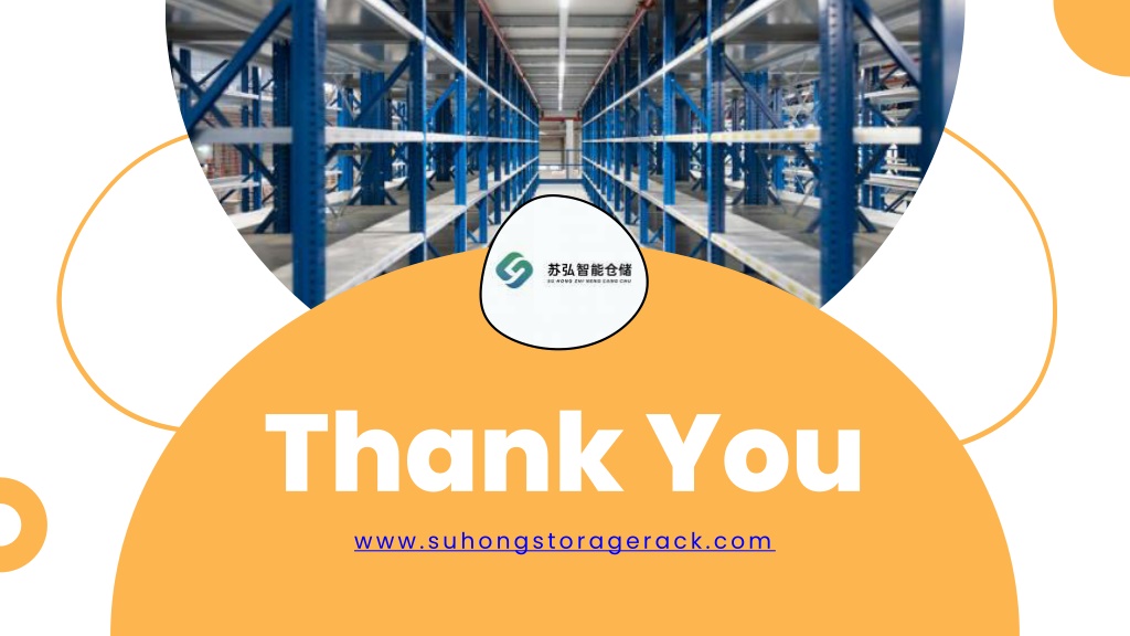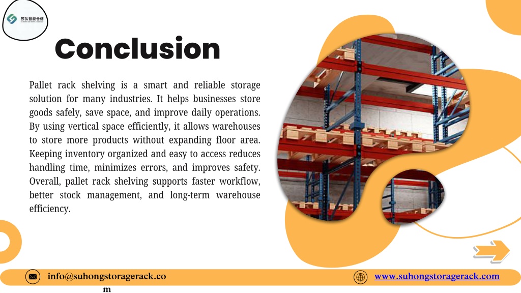 Conclusion • Pallet rack shelving is a smart and reliable storage solution for many industries. It helps businesses store goods safely, save space, and improve daily operations. By using vertical space efficiently, it allows warehouses to store more products without expanding floor area. Keeping inventory organized and easy to access reduces handling time, minimizes errors, and improves safety. Overall, pallet rack shelving supports faster workflow, better stock management, and long-term warehouse efficiency. • info@suhongstoragerack.com www.suhongstoragerack.com