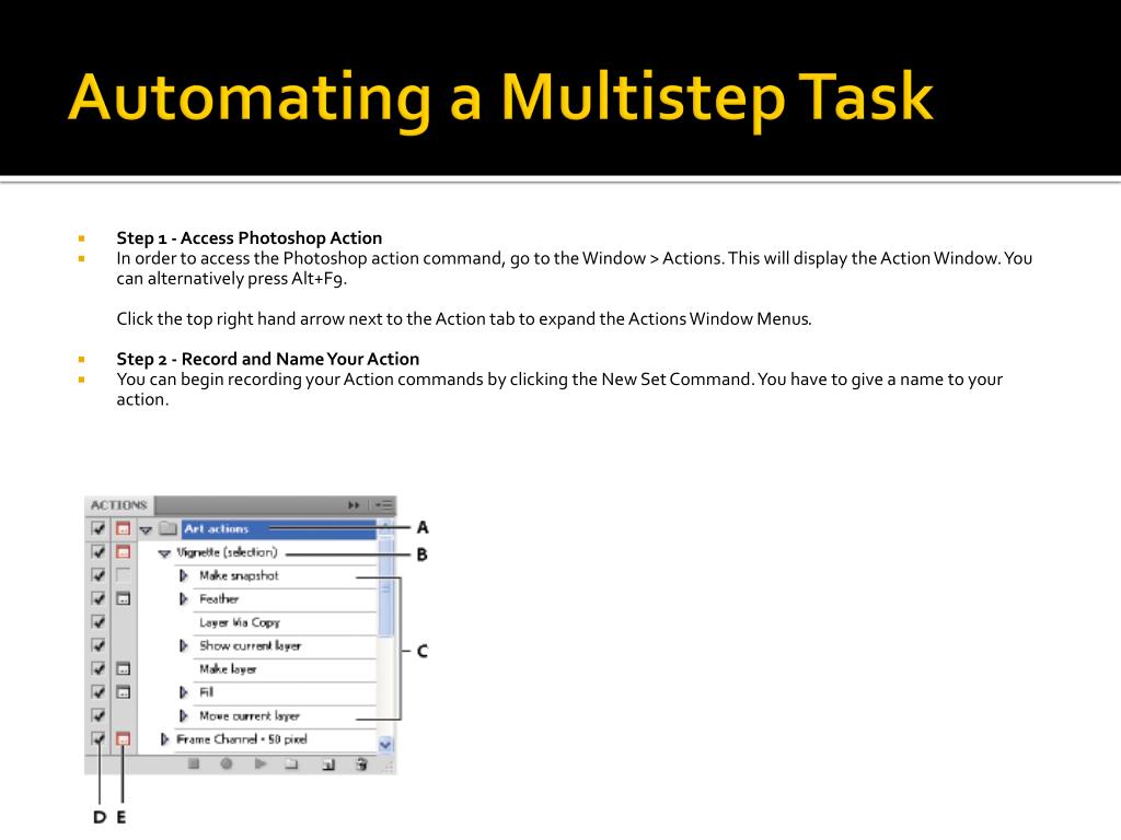 Automating a Multistep Task • Step 1 - Access Photoshop Action • In order to access the Photoshop action command, go to the Window > Actions. This will display the Action Window. You can alternatively press Alt+F9. Click the top right hand arrow next to the Action tab to expand the Actions Window Menus. • Step 2 - Record and Name Your Action • You can begin recording your Action commands by clicking the New Set Command. You have to give a name to your action.