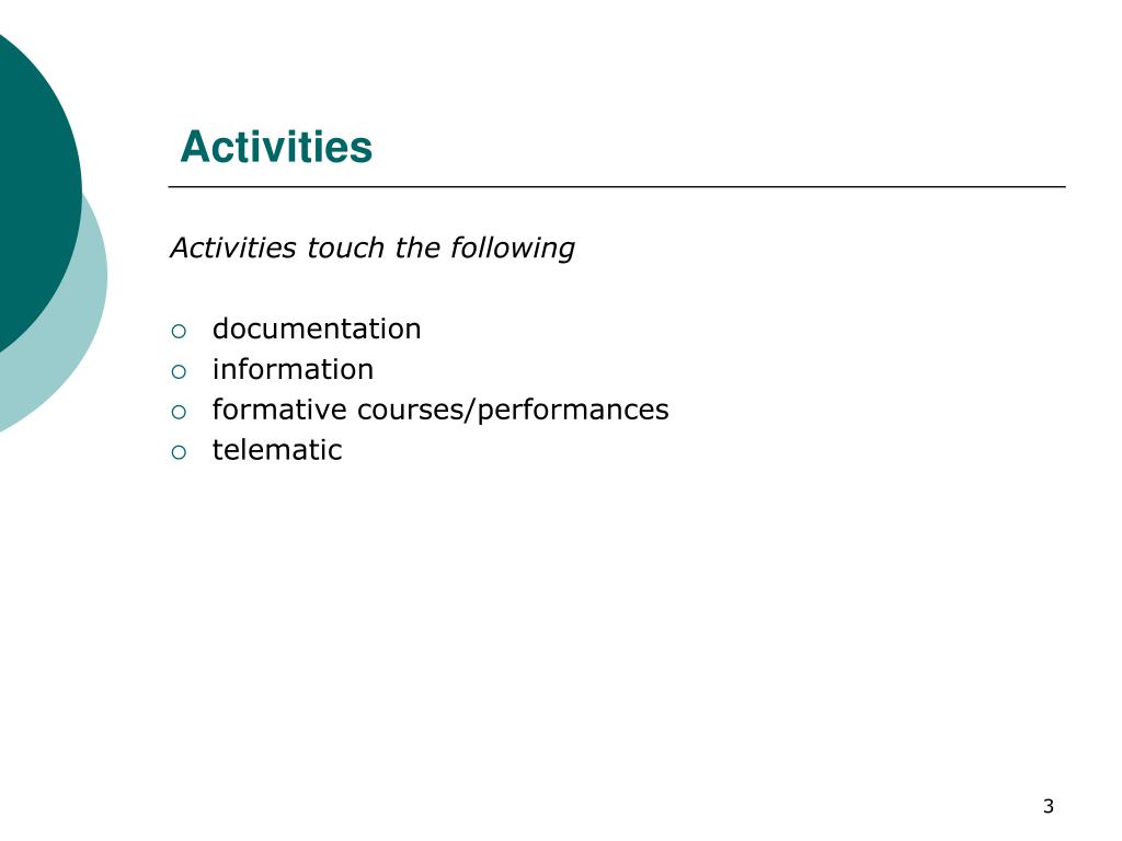 Activities Activities touch the following • documentation • information • formative courses/performances • telematic