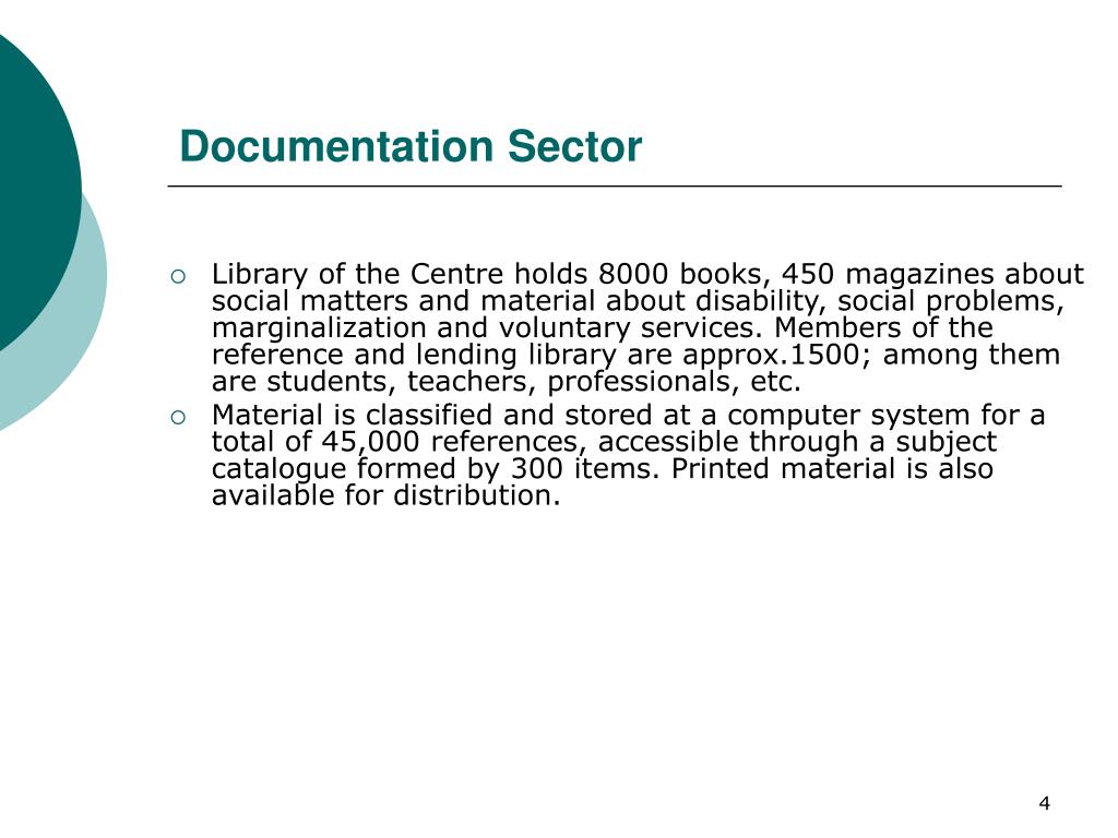 Documentation Sector • Library of the Centre holds 8000 books, 450 magazines about social matters and material about disability, social problems, marginalization and voluntary services. Members of the reference and lending library are approx.1500; among them are students, teachers, professionals, etc. • Material is classified and stored at a computer system for a total of 45,000 references, accessible through a subject catalogue formed by 300 items. Printed material is also available for distribution.