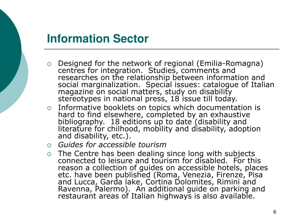 Information Sector • Designed for the network of regional (Emilia-Romagna) centres for integration. Studies, comments and researches on the relationship between information and social marginalization. Special issues: catalogue of Italian magazine on social matters, study on disability stereotypes in national press, 18 issue till today. • Informative booklets on topics which documentation is hard to find elsewhere, completed by an exhaustive bibliography. 18 editions up to date (disability and literature for chilhood, mobility and disability, adoption and disability, etc.). • Guides for accessible tourism • The Centre has been dealing since long with subjects connected to leisure and tourism for disabled. For this reason a collection of guides on accessible hotels, places etc. have been published (Roma, Venezia, Firenze, Pisa and Lucca, Garda lake, Cortina Dolomites, Rimini and Ravenna, Palermo). An additional guide on parking and restaurant areas of Italian highways is also available.