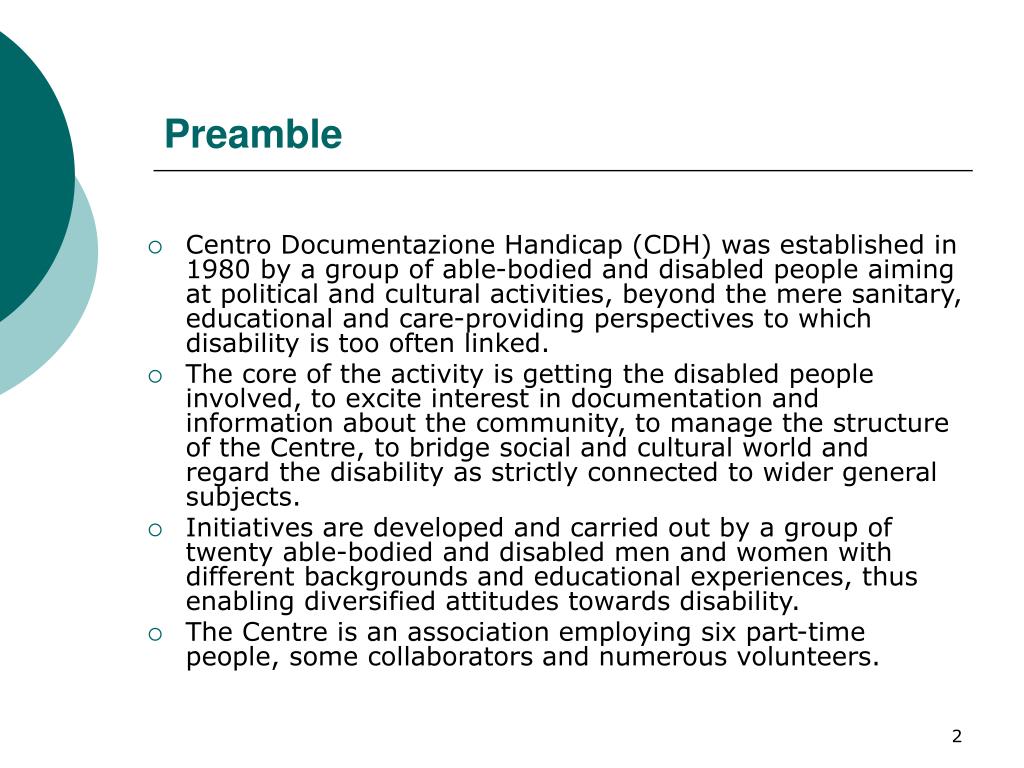 Preamble • Centro Documentazione Handicap (CDH) was established in 1980 by a group of able-bodied and disabled people aiming at political and cultural activities, beyond the mere sanitary, educational and care-providing perspectives to which disability is too often linked. • The core of the activity is getting the disabled people involved, to excite interest in documentation and information about the community, to manage the structure of the Centre, to bridge social and cultural world and regard the disability as strictly connected to wider general subjects. • Initiatives are developed and carried out by a group of twenty able-bodied and disabled men and women with different backgrounds and educational experiences, thus enabling diversified attitudes towards disability. • The Centre is an association employing six part-time people, some collaborators and numerous volunteers.