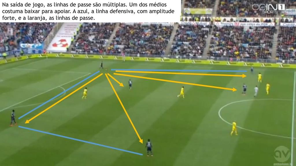 Na saída de jogo, as linhas de passe são múltiplas. Um dos médios costuma baixar para apoiar. A azul, a linha defensiva, com amplitude forte, e a laranja, as linhas de passe.