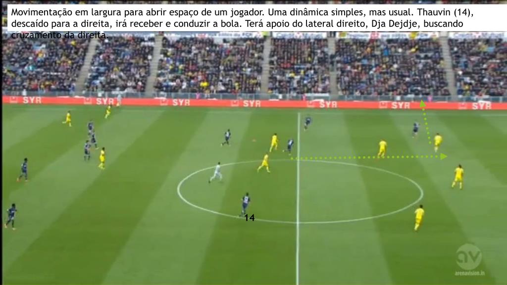Movimentação em largura para abrir espaço de um jogador. Uma dinâmica simples, mas usual. Thauvin (14), descaído para a direita, irá receber e conduzir a bola. Terá apoio do lateral direito, DjaDejdje, buscando cruzamento da direita. 14