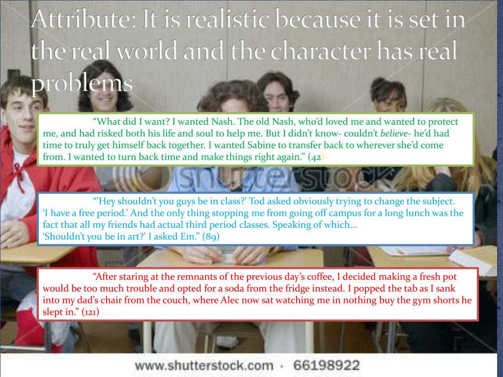 Attribute: It is realistic because it is set in the real world and the character has real problems “What did I want? I wanted Nash. The old Nash, who’d loved me and wanted to protect me, and had risked both his life and soul to help me. But I didn’t know- couldn’t believe- he’d had time to truly get himself back together. I wanted Sabine to transfer back to wherever she’d come from. I wanted to turn back time and make things right again.” (42) “’Hey shouldn’t you guys be in class?’ Tod asked obviously trying to change the subject. ‘I have a free period.’ And the only thing stopping me from going off campus for a long lunch was the fact that all my friends had actual third period classes. Speaking of which… ‘Shouldn’t you be in art?’ I asked Em.” (89) “After staring at the remnants of the previous day’s coffee, I decided making a fresh pot would be too much trouble and opted for a soda from the fridge instead. I popped the tab as I sank into my dad’s chair from the couch, where Alec now sat watching me in nothing buy the gym shorts he slept in.” (121)