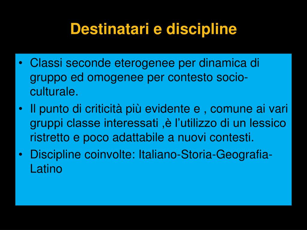Destinatari e discipline • Classi seconde eterogenee per dinamica di gruppo ed omogenee per contesto socio-culturale. • Il punto di criticità più evidente e , comune ai vari gruppi classe interessati ,è l’utilizzo di un lessico ristretto e poco adattabile a nuovi contesti. • Discipline coinvolte: Italiano-Storia-Geografia-Latino
