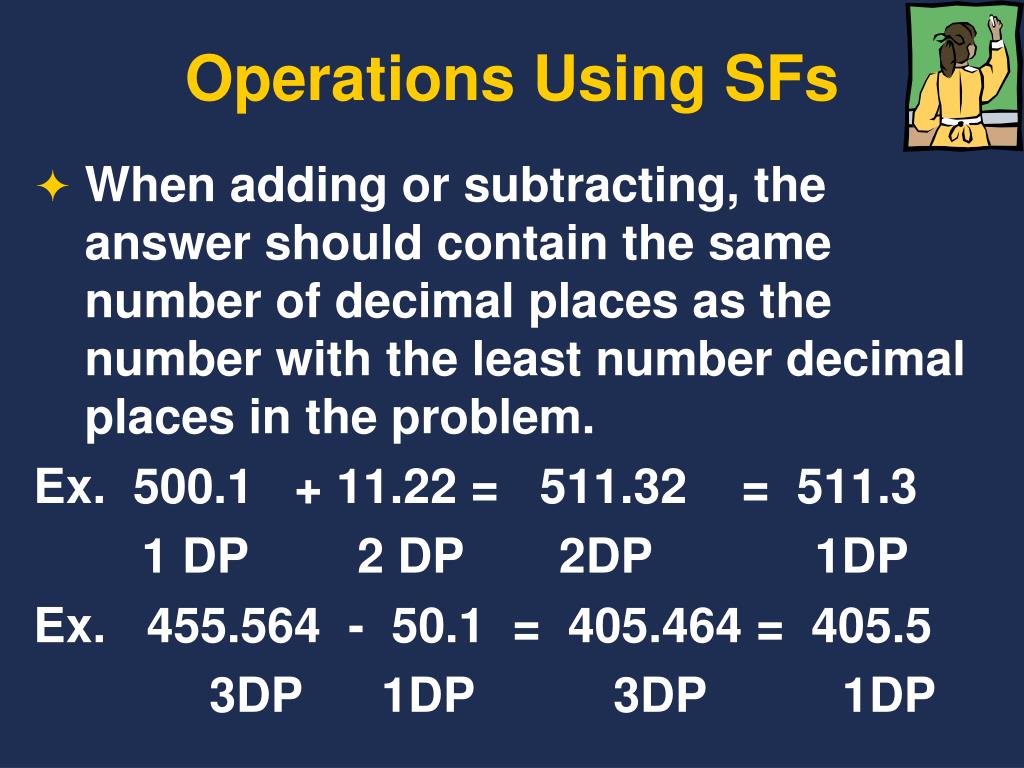 Operations Using SFs • When adding or subtracting, the answer should contain the same number of decimal places as the number with the least number decimal places in the problem. Ex. 500.1 + 11.22 = 511.32 = 511.3 1 DP 2 DP 2DP 1DP Ex. 455.564 - 50.1 = 405.464 = 405.5 3DP 1DP 3DP 1DP