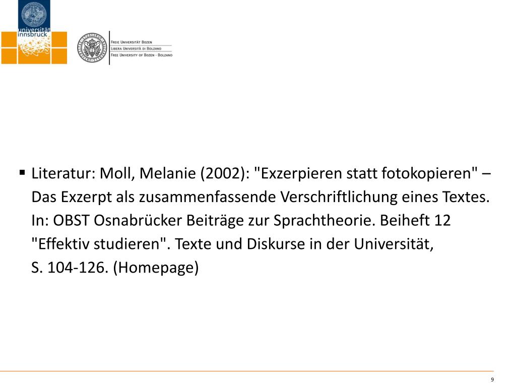 Literatur: Moll, Melanie (2002): "Exzerpieren statt fotokopieren" – Das Exzerpt als zusammenfassende Verschriftlichung eines Textes.In: OBST Osnabrücker Beiträge zur Sprachtheorie. Beiheft 12"Effektiv studieren". Texte und Diskurse in der Universität,S. 104-126. (Homepage)