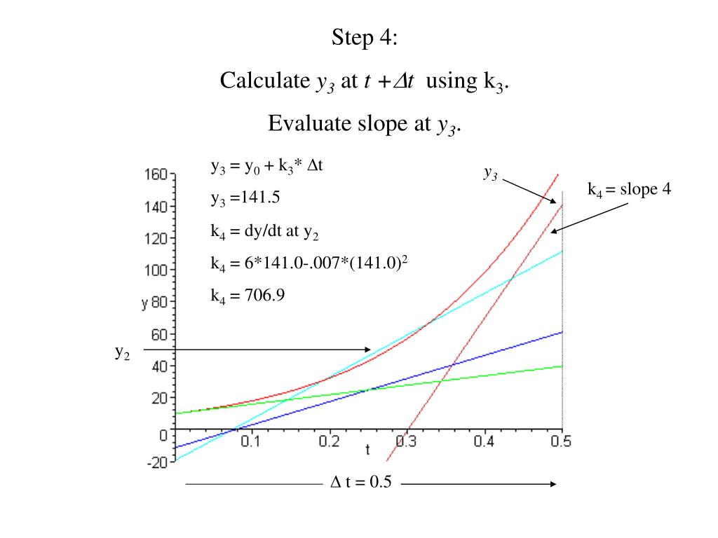 Step 3: Calculate y2 at t +t/2 using k2. Evaluate slope at y2. y2 = y0 + k2* t /2 y2 = 46.2 k3 = slope 3 k3 = dy/dt at y2 k3 = 6*46.2-.007*(46.2)2 k3 = 263.0 y2 t = 0.5/2