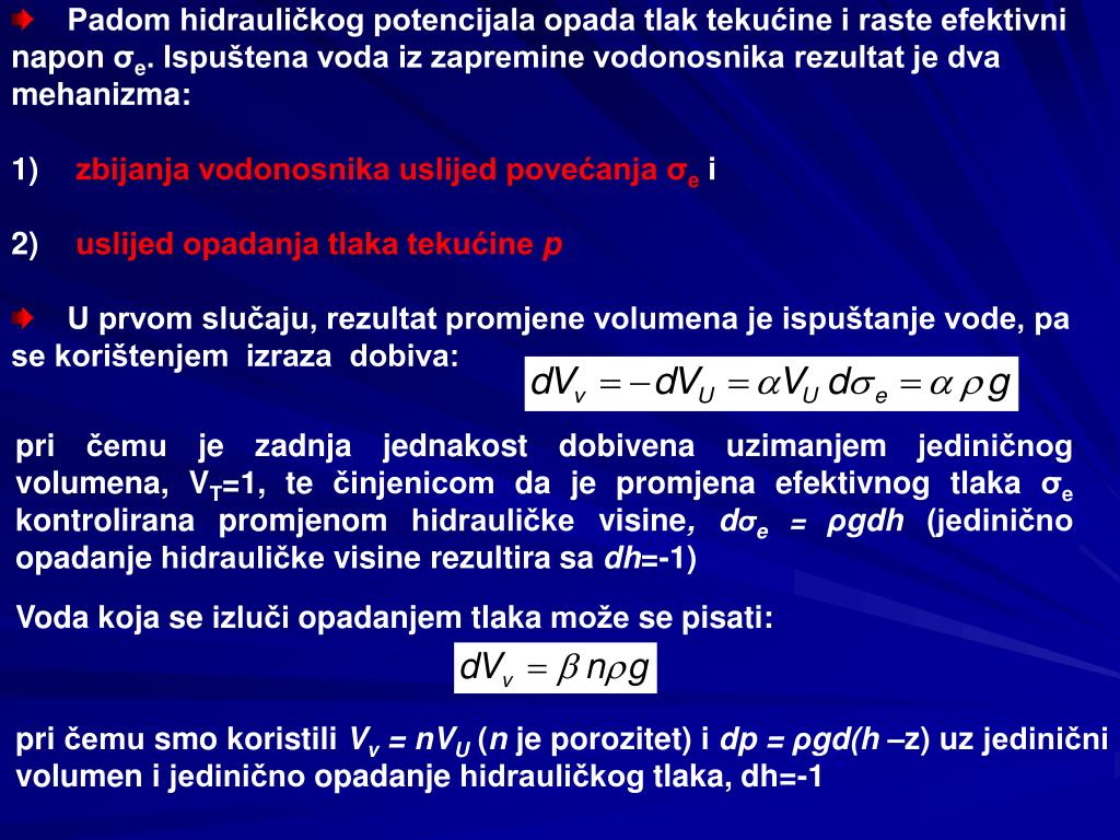 Padom hidrauličkog potencijala opada tlak tekućine i raste efektivni napon σe. Ispuštena voda iz zapremine vodonosnika rezultat je dva mehanizma: • zbijanja vodonosnika uslijed povećanja σe i • uslijed opadanja tlaka tekućine p • U prvom slučaju, rezultat promjene volumena je ispuštanje vode, pa se korištenjem izraza dobiva: pri čemu je zadnja jednakost dobivena uzimanjem jediničnog volumena, VT=1, te činjenicom da je promjena efektivnog tlaka σe kontrolirana promjenom hidrauličke visine, dσe = ρgdh (jedinično opadanje hidrauličke visine rezultira sa dh=-1) Voda koja se izluči opadanjem tlaka može se pisati: pri čemu smo koristili Vv = nVU (n je porozitet) i dp = ρgd(h –z) uz jedinični volumen i jedinično opadanje hidrauličkog tlaka, dh=-1