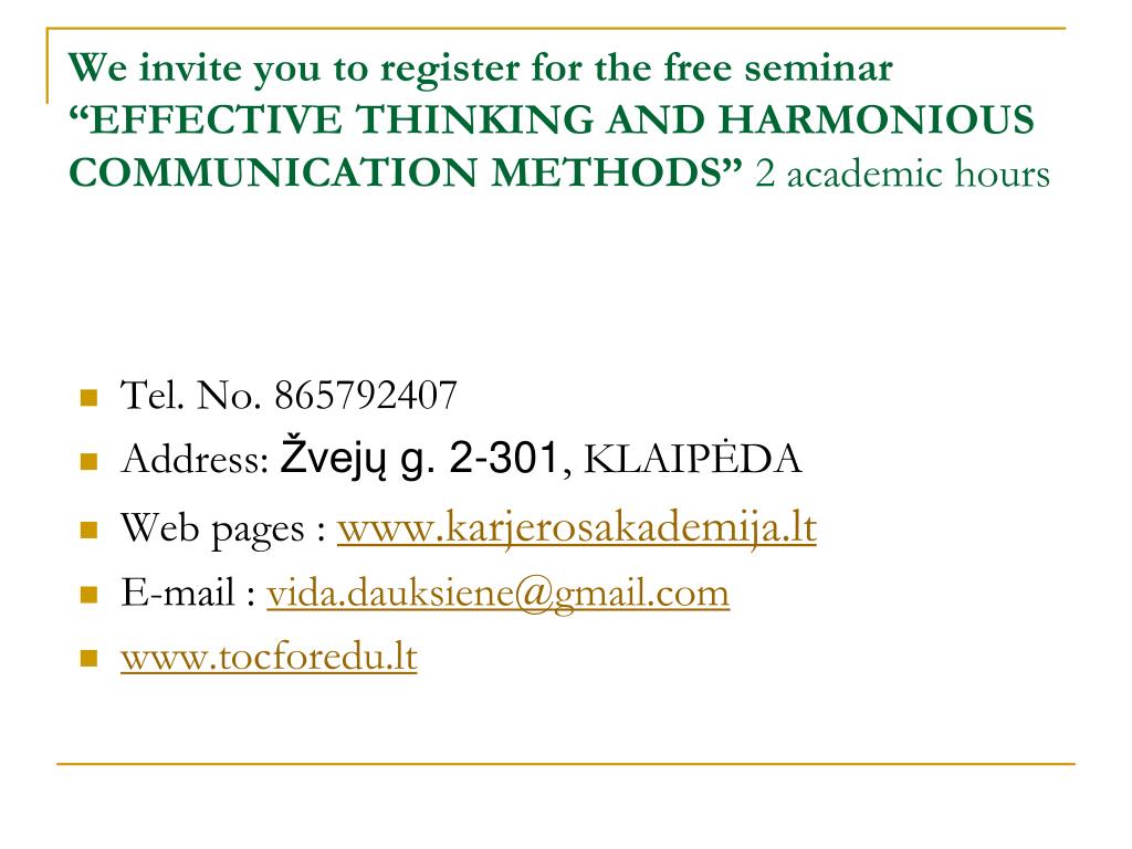 We invite you to register for the free seminar“EFFECTIVE THINKING AND HARMONIOUS COMMUNICATION METHODS” 2academichours • Tel. No. 865792407 • Address: Žvejų g. 2-301, KLAIPĖDA • Web pages : www.karjerosakademija.lt • E-mail : vida.dauksiene@gmail.com • www.tocforedu.lt
