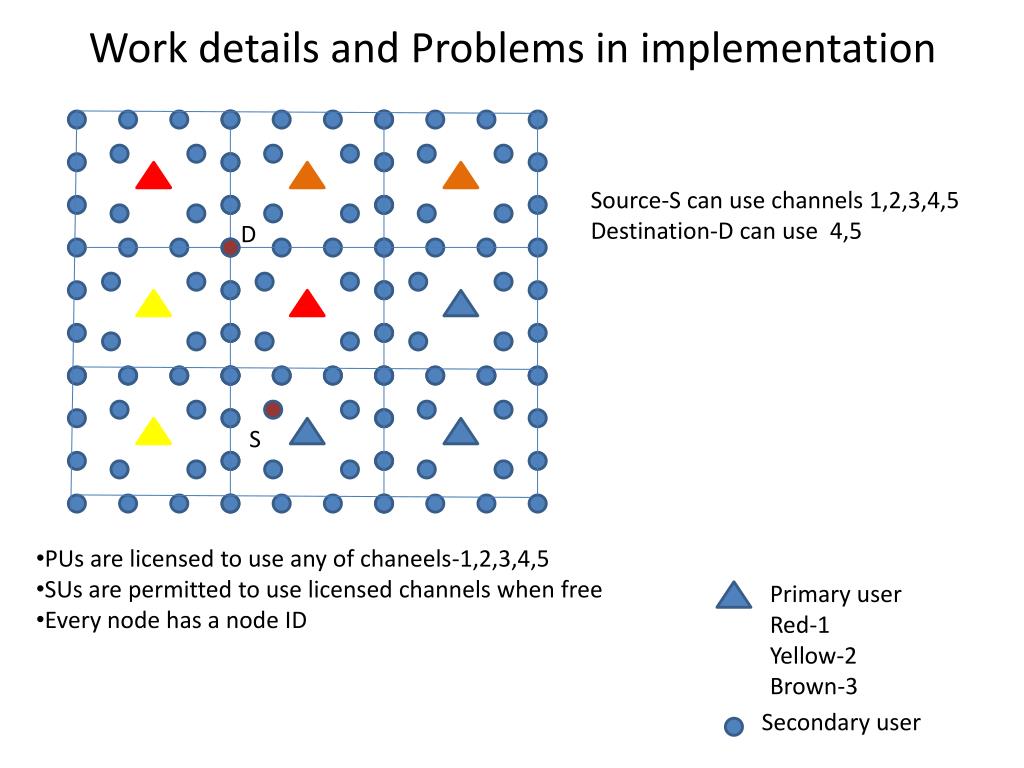 Work details and Problems in implementation Source-S can use channels 1,2,3,4,5 Destination-D can use 4,5 D S • PUs are licensed to use any of chaneels-1,2,3,4,5 • SUs are permitted to use licensed channels when free • Every node has a node ID Primary user Red-1 Yellow-2 Brown-3 Secondary user