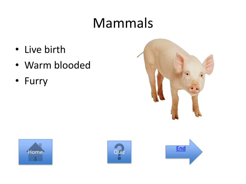 Mammals • Live birth • Warm blooded • Furry Home End Quiz