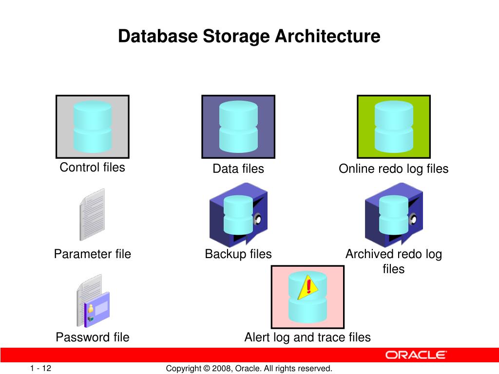 Database Storage Architecture Control files • Data files • Online redo log files • Parameter file • Backup files • Archived redo log files • Password file • Alert log and trace files