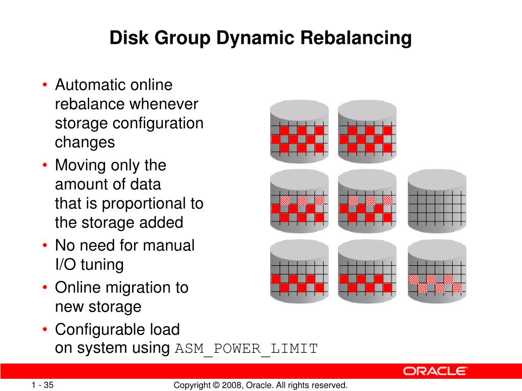 Disk Group Dynamic Rebalancing • Automatic online rebalance wheneverstorage configurationchanges • Moving only the amount of data that is proportional to the storage added • No need for manual I/O tuning • Online migration tonew storage • Configurable loadon system using ASM_POWER_LIMIT