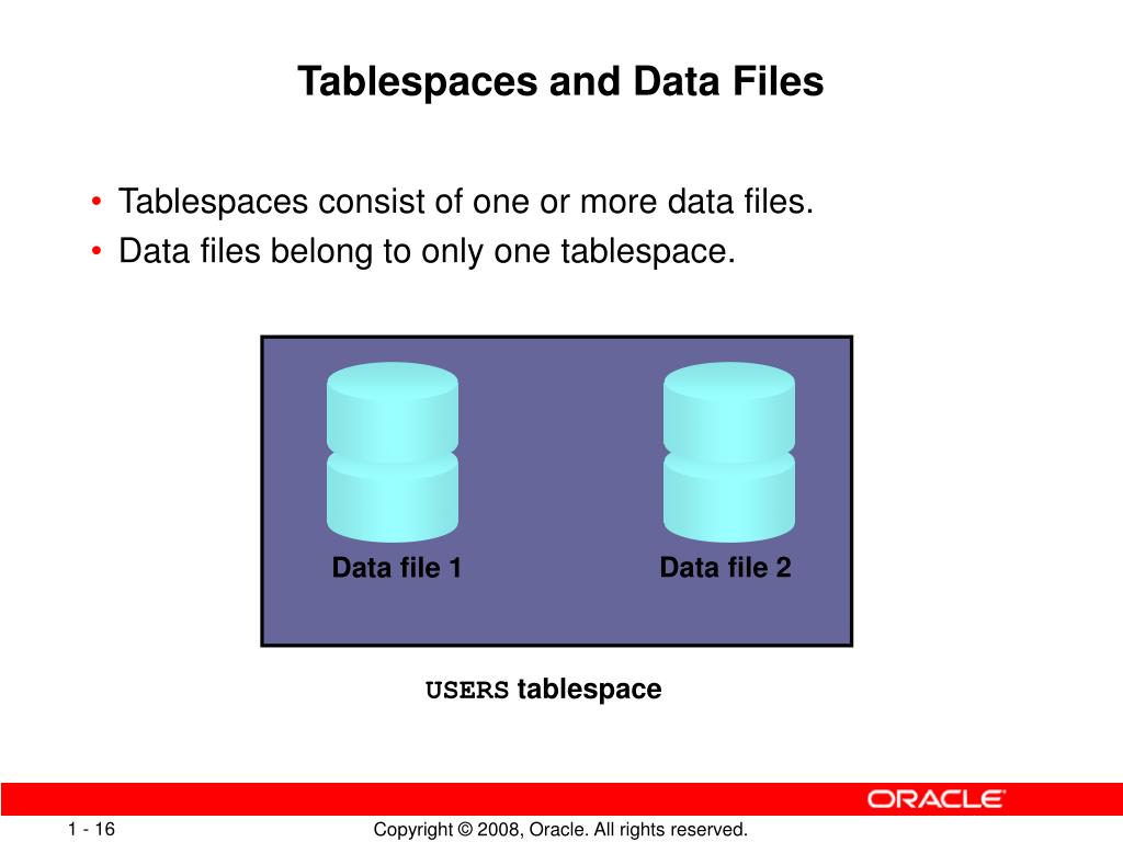 Tablespaces and Data Files • Tablespaces consist of one or more data files. • Data files belong to only one tablespace. Data file 2 Data file 1 USERS tablespace
