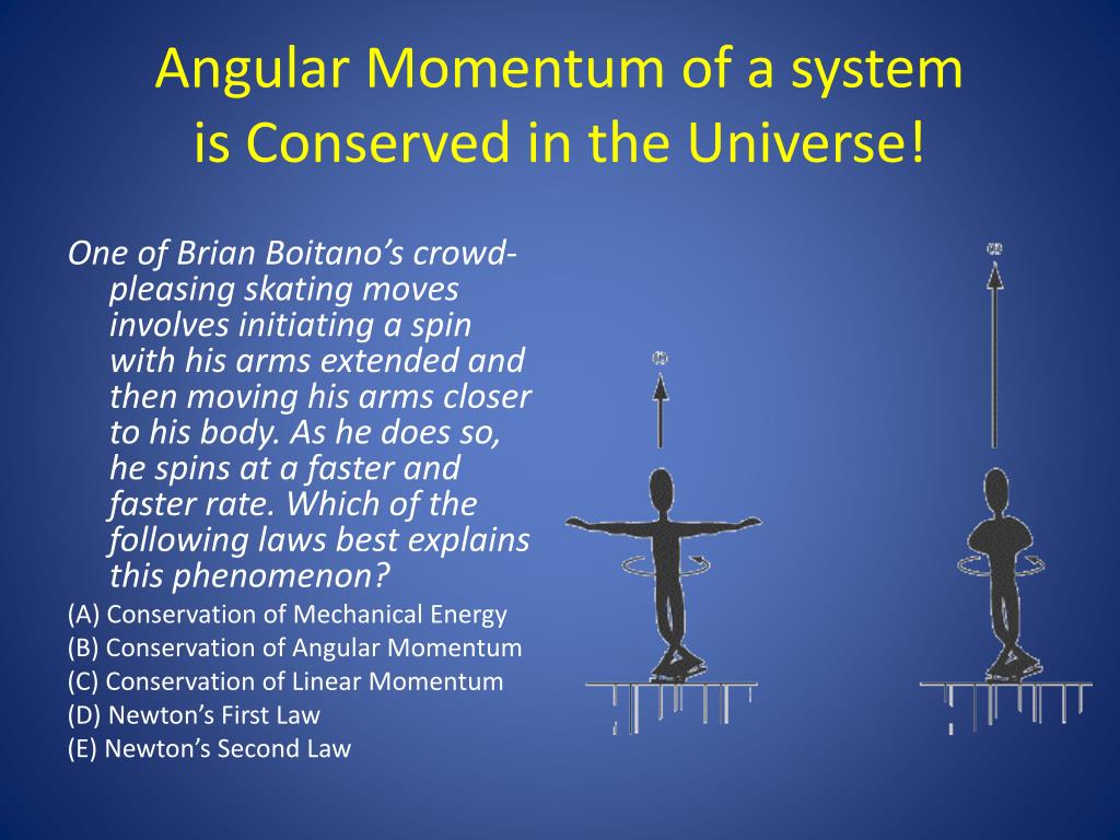 Angular Momentum of a system is Conserved in the Universe! One of Brian Boitano’s crowd-pleasing skating moves involves initiating a spin with his arms extended and then moving his arms closer to his body. As he does so, he spins at a faster and faster rate. Which of the following laws best explains this phenomenon? (A) Conservation of Mechanical Energy (B) Conservation of Angular Momentum (C) Conservation of Linear Momentum (D) Newton’s First Law (E) Newton’s Second Law