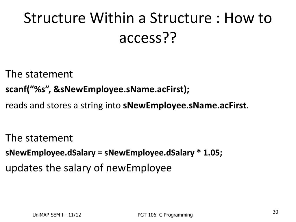 Structure Within a Structure : How to access?? The statement scanf(“%s”, &sNewEmployee.sName.acFirst); reads and stores a string into sNewEmployee.sName.acFirst. The statement sNewEmployee.dSalary = sNewEmployee.dSalary * 1.05; updates the salary of newEmployee PGT 106 C Programming