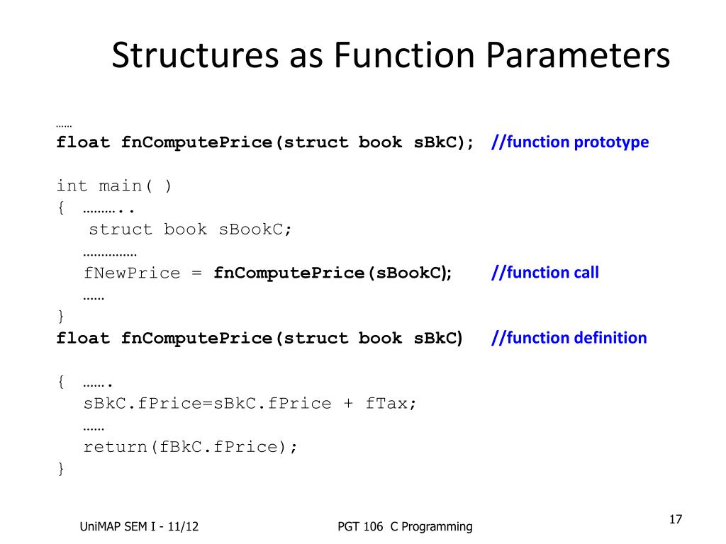Structures as Function Parameters …… float fnComputePrice(struct book sBkC);//function prototype int main( ) { ……….. struct book sBookC; …………… fNewPrice = fnComputePrice(sBookC); //function call …… } float fnComputePrice(struct book sBkC) //function definition { ……. sBkC.fPrice=sBkC.fPrice + fTax; …… return(fBkC.fPrice); } PGT 106 C Programming