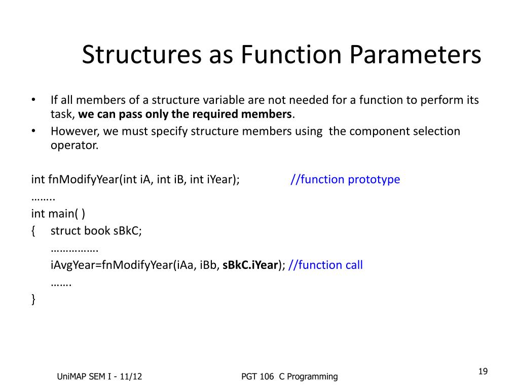 Structures as Function Parameters • If all members of a structure variable are not needed for a function to perform its task, we can pass only the required members. • However, we must specify structure members using the component selection operator. int fnModifyYear(int iA, int iB, int iYear); //function prototype …….. int main( ) { struct book sBkC; ……………. iAvgYear=fnModifyYear(iAa, iBb, sBkC.iYear); //function call ……. } PGT 106 C Programming
