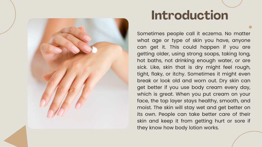 Introduction Sometimes people call it eczema. No matter what age or type of skin you have, anyone can get it. This could happen if you are getting older, using strong soaps, taking long, hot baths, not drinking enough water, or are sick. Like, skin that is dry might feel rough, tight, flaky, or itchy. Sometimes it might even break or look old and worn out. Dry skin can get better if you use body cream every day, which is great. When you put cream on your face, the top layer stays healthy, smooth, and moist. The skin will stay wet and get better on its own. People can take better care of their skin and keep it from getting hurt or sore if they know how body lotion works.