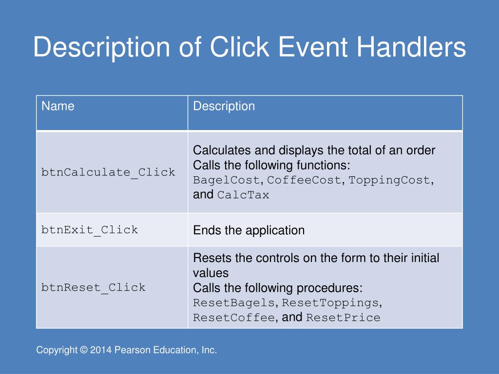 btnCalculate_ClickPseudocode • Calculates the total of an order and displays its price subtotal = BagelCost() + ToppingCost() + CoffeeCost() tax = CalcTax(subtotal) total = subtotal + tax lblSubtotal.Text = subtotal lblTax.Text = tax lblTotal.Text = total