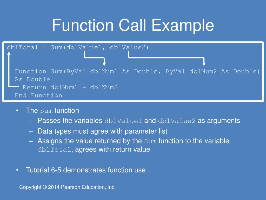 Function Call Example • The Sum function • Passes the variables dblValue1 and dblValue2 as arguments • Data types must agree with parameter list • Assigns the value returned by the Sum function to the variable dblTotal, agrees with return value • Tutorial 6-5 demonstrates function use dblTotal= Sum(dblValue1, dblValue2) Function Sum(ByVal dblNum1 As Double, ByVal dblNum2 As Double) As Double Return dblNum1 + dblNum2 End Function