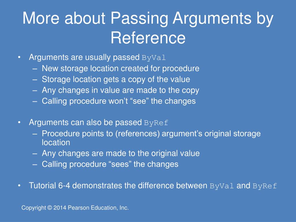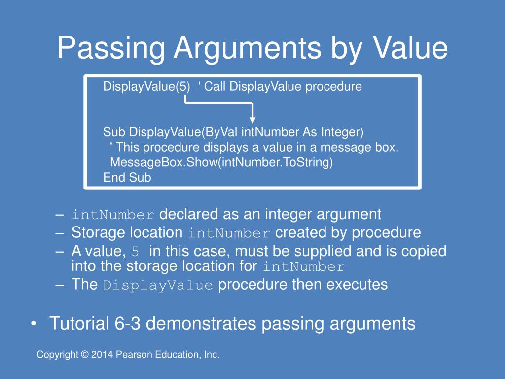 Passing Arguments by Value • intNumber declared as an integer argument • Storage location intNumber created by procedure • A value, 5 in this case, must be supplied and is copied into the storage location for intNumber • The DisplayValue procedure then executes • Tutorial 6-3 demonstrates passing arguments DisplayValue(5)' Call DisplayValue procedure Sub DisplayValue(ByValintNumber As Integer) ' This procedure displays a value in a message box. MessageBox.Show(intNumber.ToString) End Sub