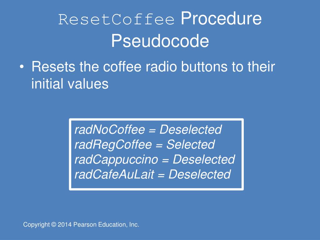 ResetCoffeeProcedure Pseudocode • Resets the coffee radio buttons to their initial values radNoCoffee = Deselected radRegCoffee = Selected radCappuccino = Deselected radCafeAuLait = Deselected