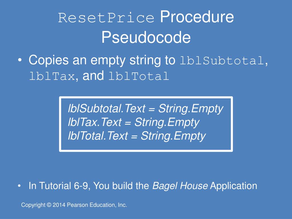 ResetPrice ProcedurePseudocode • Copies an empty string to lblSubtotal, lblTax, and lblTotal • In Tutorial 6-9, You build the Bagel House Application lblSubtotal.Text = String.Empty lblTax.Text = String.Empty lblTotal.Text = String.Empty