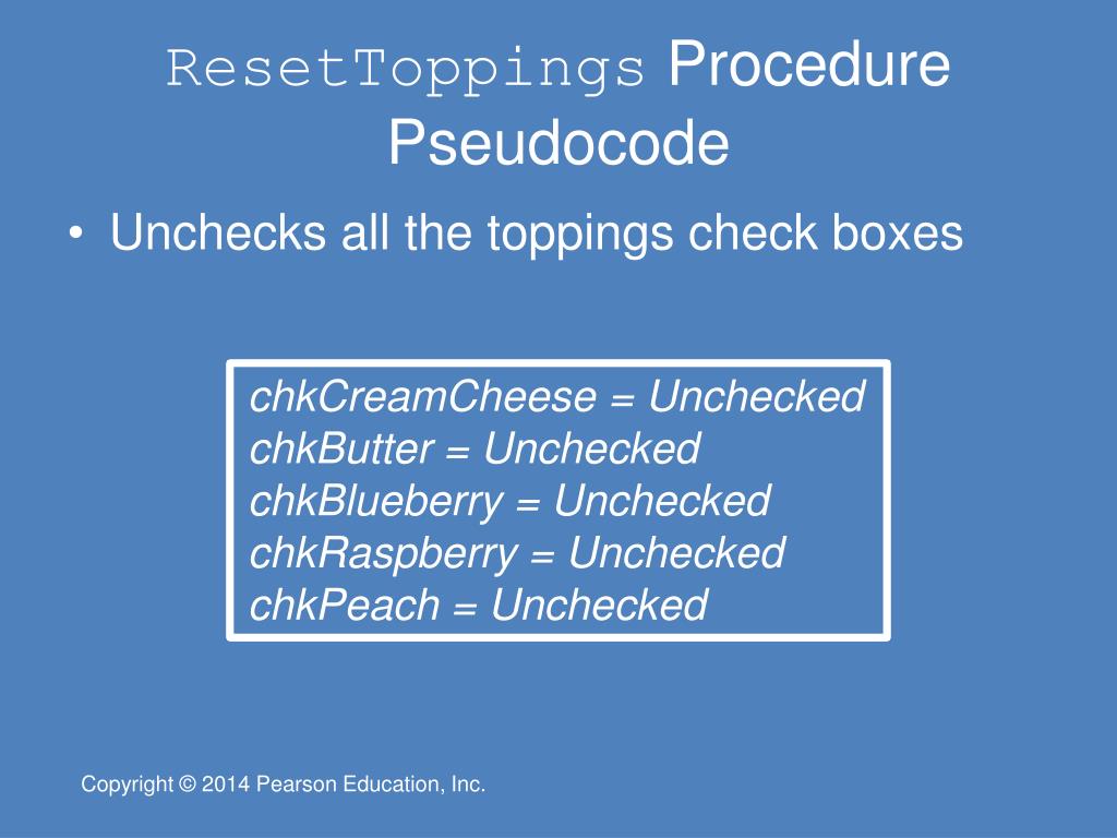 ResetToppingsProcedure Pseudocode • Unchecks all the toppings check boxes chkCreamCheese = Unchecked chkButter = Unchecked chkBlueberry = Unchecked chkRaspberry = Unchecked chkPeach = Unchecked