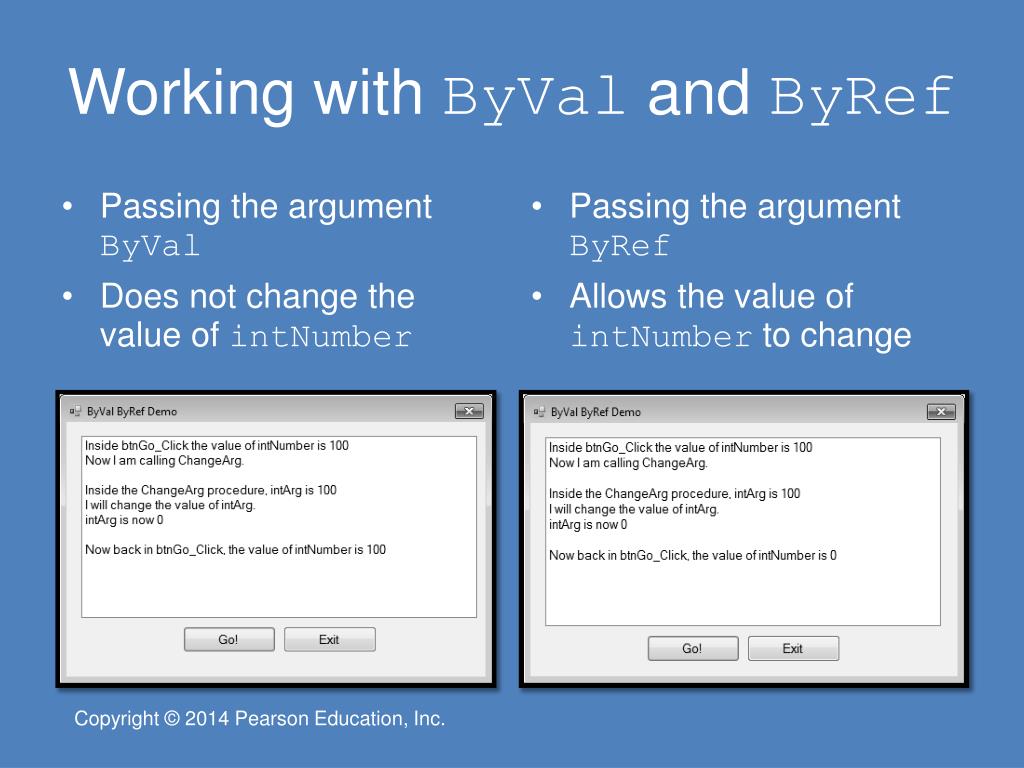 Working with ByVal and ByRef • Passing the argument ByVal • Does not change the value of intNumber • Passing the argument ByRef • Allows the value of intNumber to change