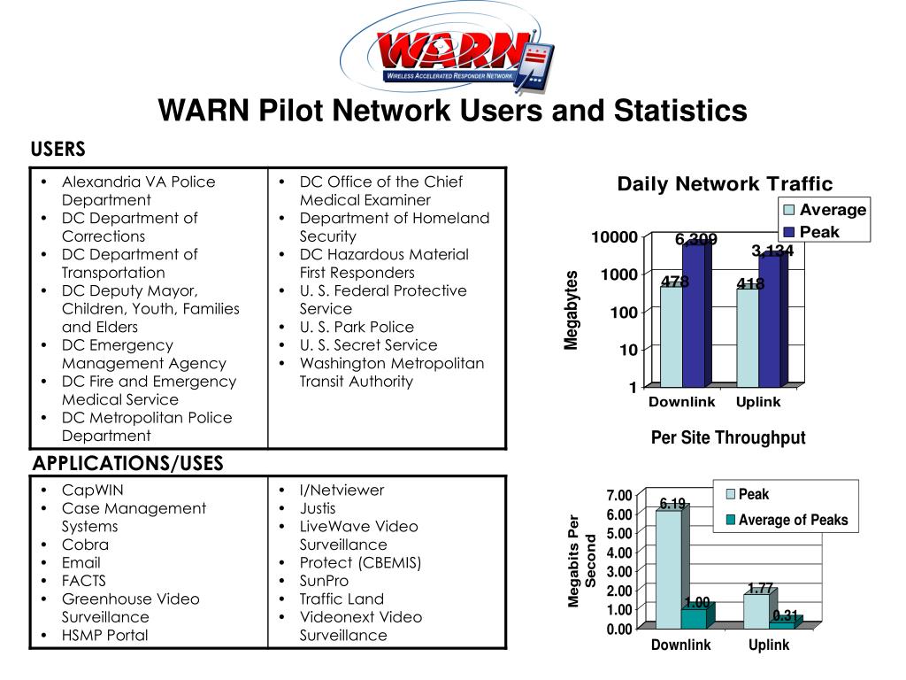 WARN Pilot Network Users and Statistics USERS APPLICATIONS/USES