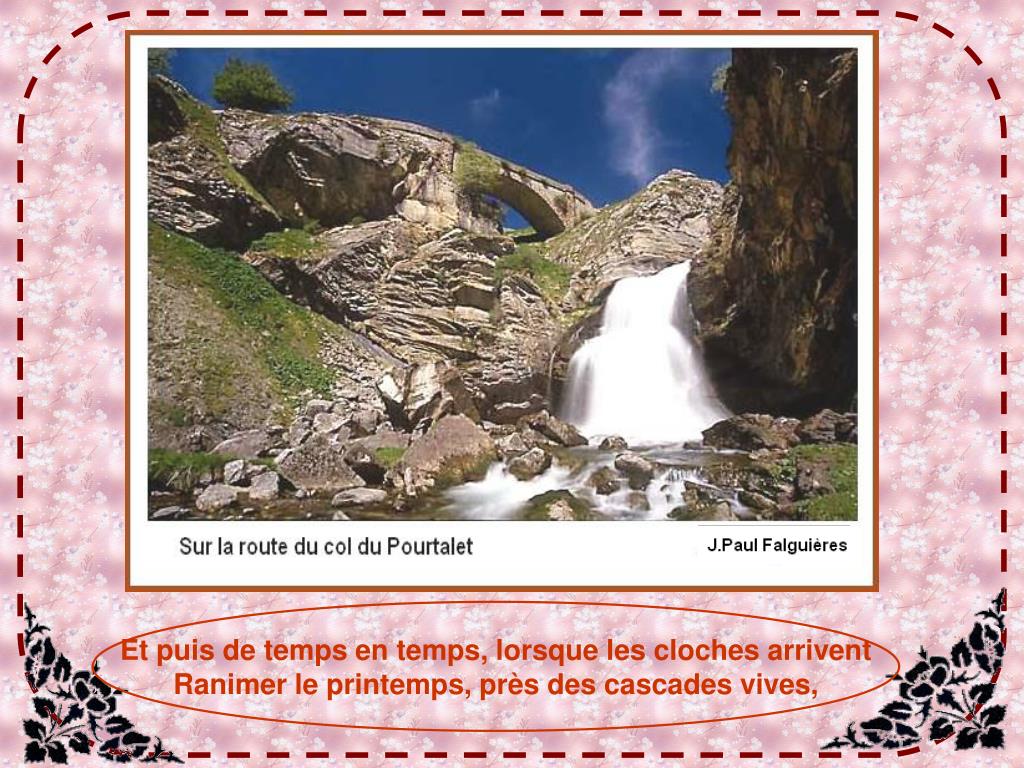 Et puis de temps en temps, lorsque les cloches arrivent Ranimer le printemps, près des cascades vives,