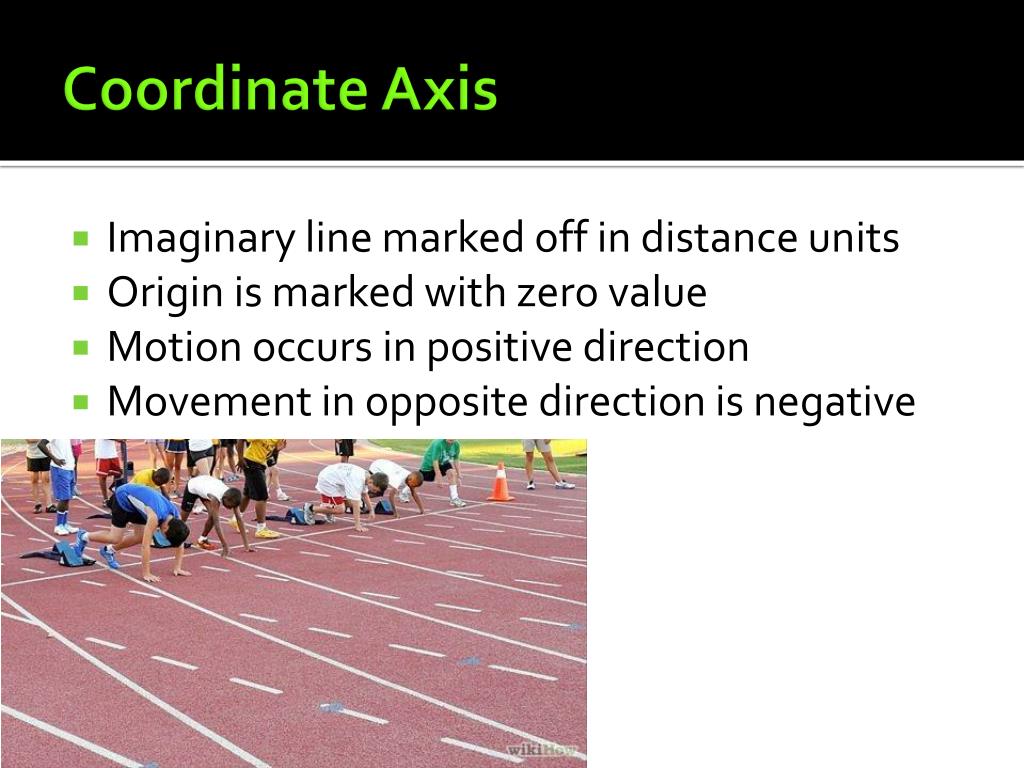 Coordinate Axis • Imaginary line marked off in distance units • Origin is marked with zero value • Motion occurs in positive direction • Movement in opposite direction is negative
