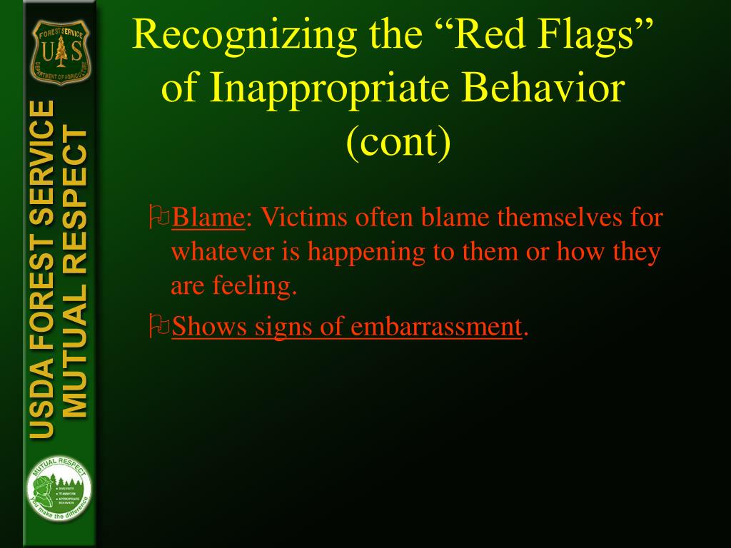 Recognizing the “Red Flags” of Inappropriate Behavior (cont) • Blame: Victims often blame themselves for whatever is happening to them or how they are feeling. • Shows signs of embarrassment.