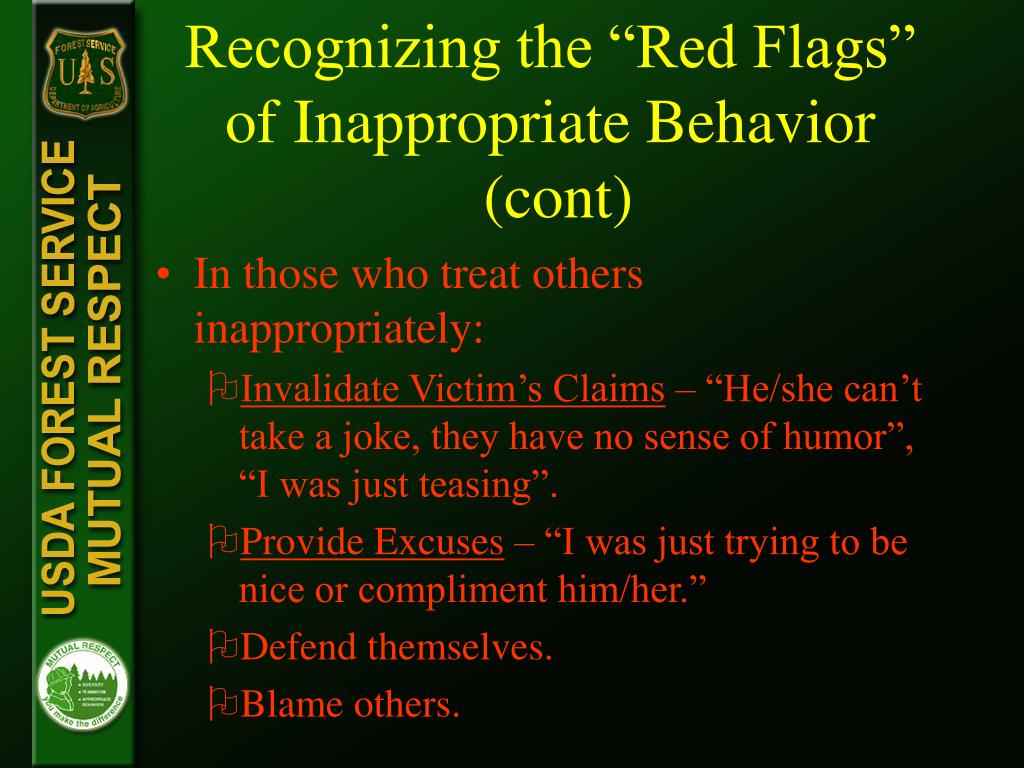 Recognizing the “Red Flags” of Inappropriate Behavior (cont) • In those who treat others inappropriately: • Invalidate Victim’s Claims – “He/she can’t take a joke, they have no sense of humor”, “I was just teasing”. • Provide Excuses – “I was just trying to be nice or compliment him/her.” • Defend themselves. • Blame others.