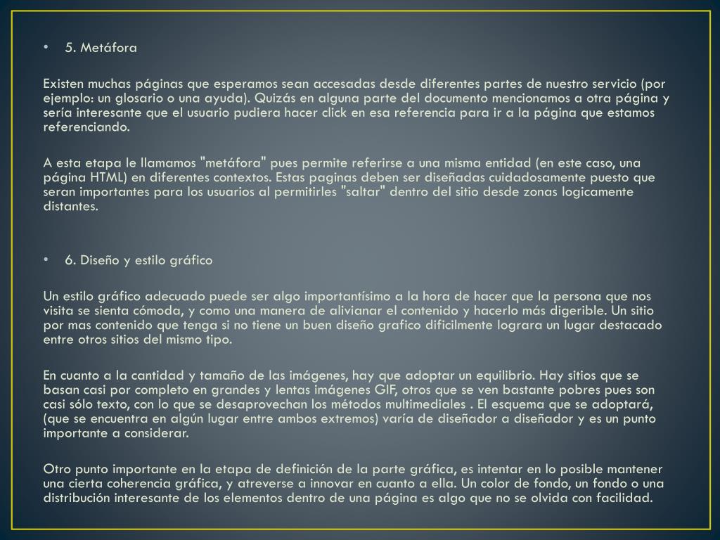 5. Metáfora Existen muchas páginas que esperamos sean accesadas desde diferentes partes de nuestro servicio (por ejemplo: un glosario o una ayuda). Quizás en alguna parte del documento mencionamos a otra página y sería interesante que el usuario pudiera hacer click en esa referencia para ir a la página que estamos referenciando. A esta etapa le llamamos "metáfora" pues permite referirse a una misma entidad (en este caso, una página HTML) en diferentes contextos. Estas paginas deben ser diseñadas cuidadosamente puesto que seran importantes para los usuarios al permitirles "saltar" dentro del sitio desde zonas logicamente distantes. • 6. Diseño y estilo gráfico Un estilo gráfico adecuado puede ser algo importantísimo a la hora de hacer que la persona que nos visita se sienta cómoda, y como una manera de alivianar el contenido y hacerlo más digerible. Un sitio por mas contenido que tenga si no tiene un buen diseño grafico dificilmente lograra un lugar destacado entre otros sitios del mismo tipo. En cuanto a la cantidad y tamaño de las imágenes, hay que adoptar un equilibrio. Hay sitios que se basan casi por completo en grandes y lentas imágenes GIF, otros que se ven bastante pobres pues son casi sólo texto, con lo que se desaprovechan los métodos multimediales . El esquema que se adoptará, (que se encuentra en algún lugar entre ambos extremos) varía de diseñador a diseñador y es un punto importante a considerar. Otro punto importante en la etapa de definición de la parte gráfica, es intentar en lo posible mantener una cierta coherencia gráfica, y atreverse a innovar en cuanto a ella. Un color de fondo, un fondo o una distribución interesante de los elementos dentro de una página es algo que no se olvida con facilidad.