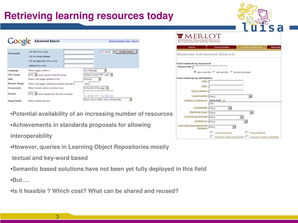 Retrieving learning resources today • Potential availability of an increasing number of resources • Achievements in standards proposals for allowing • interoperability • However, queries in Learning Object Repositories mostly • textual and key-word based • Semantic based solutions have not been yet fully deployed in this field • But…. • Is it feasible ? Which cost? What can be shared and reused?