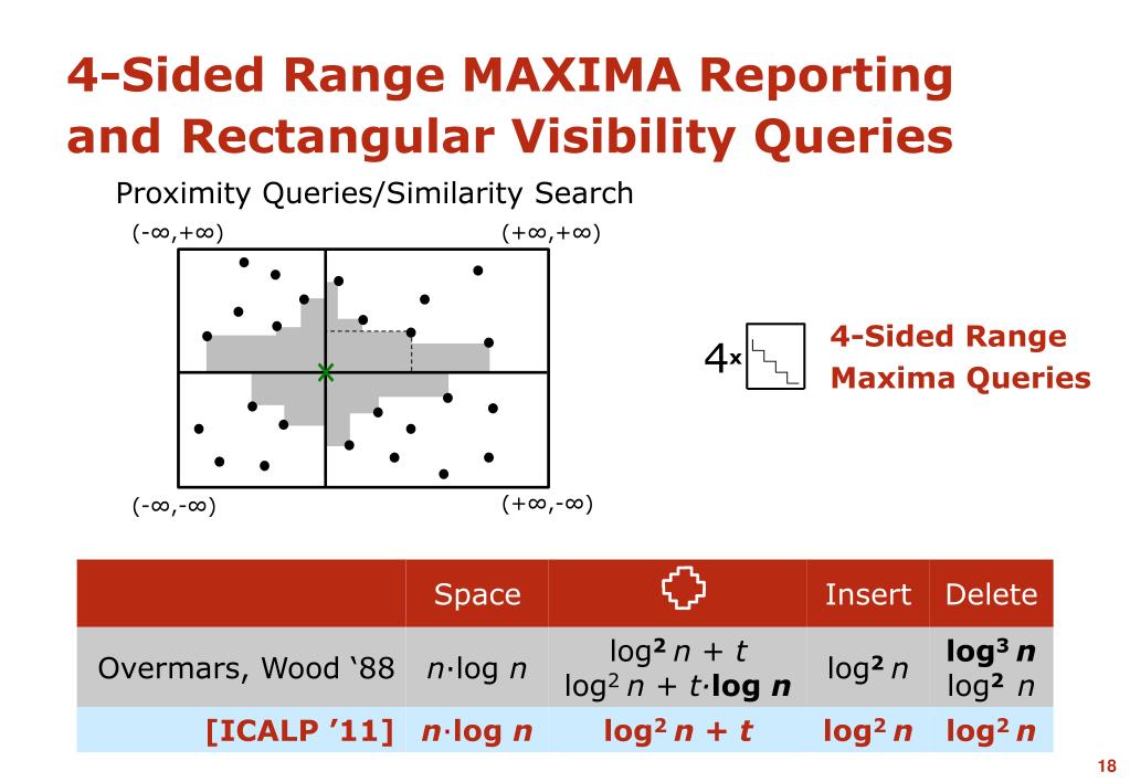 4-Sided Range MAXIMA Reporting andRectangular Visibility Queries Proximity Queries/Similarity Search (-∞,+∞) (+∞,+∞) 4-Sided Range Maxima Queries 4x (+∞,-∞) (-∞,-∞)