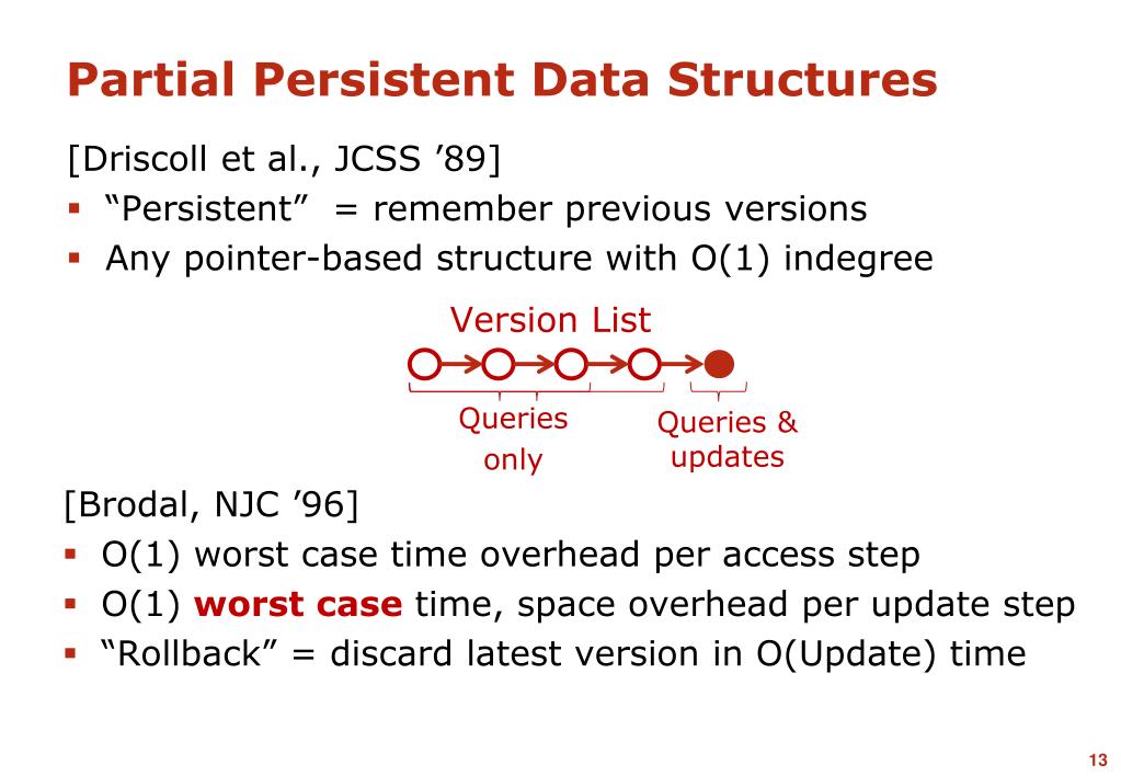 Partial Persistent Data Structures [Driscoll et al., JCSS ’89] • “Persistent” = remember previous versions • Any pointer-based structure with O(1) indegree Version List Queries only Queries & updates [Brodal, NJC ’96] • O(1) worst case time overhead per access step • O(1) worst case time, space overhead per update step • “Rollback” = discard latest version in O(Update) time