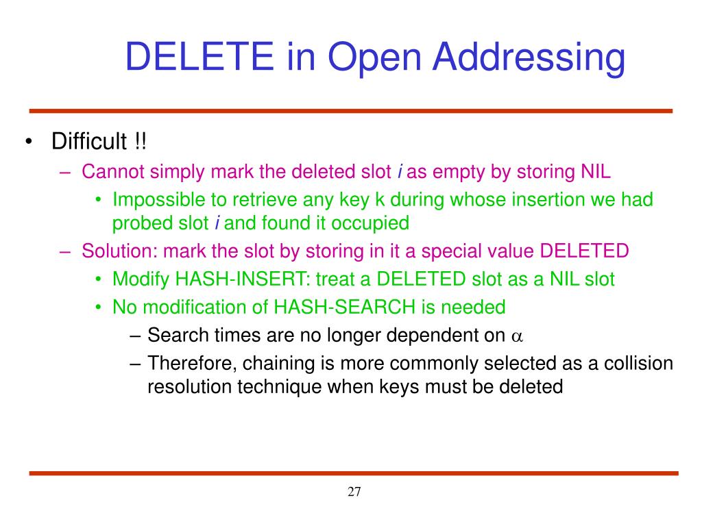 DELETE in Open Addressing • Difficult !! • Cannot simply mark the deleted slot i as empty by storing NIL • Impossible to retrieve any key k during whose insertion we had probed slot i and found it occupied • Solution: mark the slot by storing in it a special value DELETED • Modify HASH-INSERT: treat a DELETED slot as a NIL slot • No modification of HASH-SEARCH is needed • Search times are no longer dependent on • Therefore, chaining is more commonly selected as a collision resolution technique when keys must be deleted