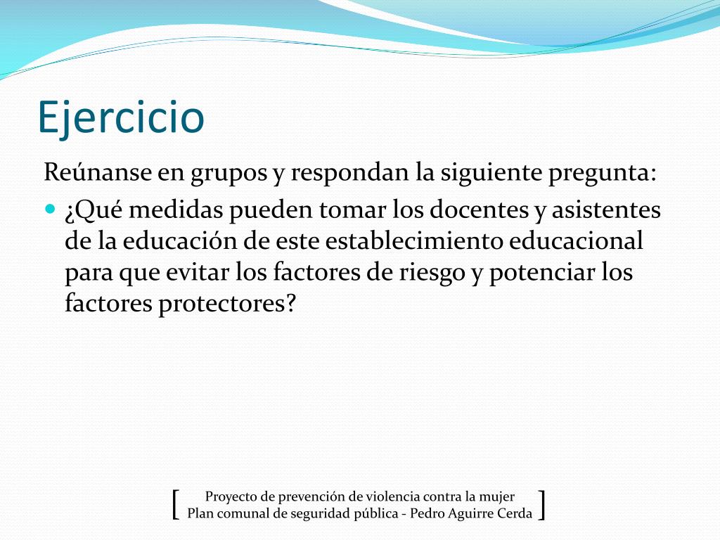 Ejercicio Reúnanse en grupos y respondan la siguiente pregunta: • ¿Qué medidas pueden tomar los docentes y asistentes de la educación de este establecimiento educacional para que evitar los factores de riesgo y potenciar los factores protectores?